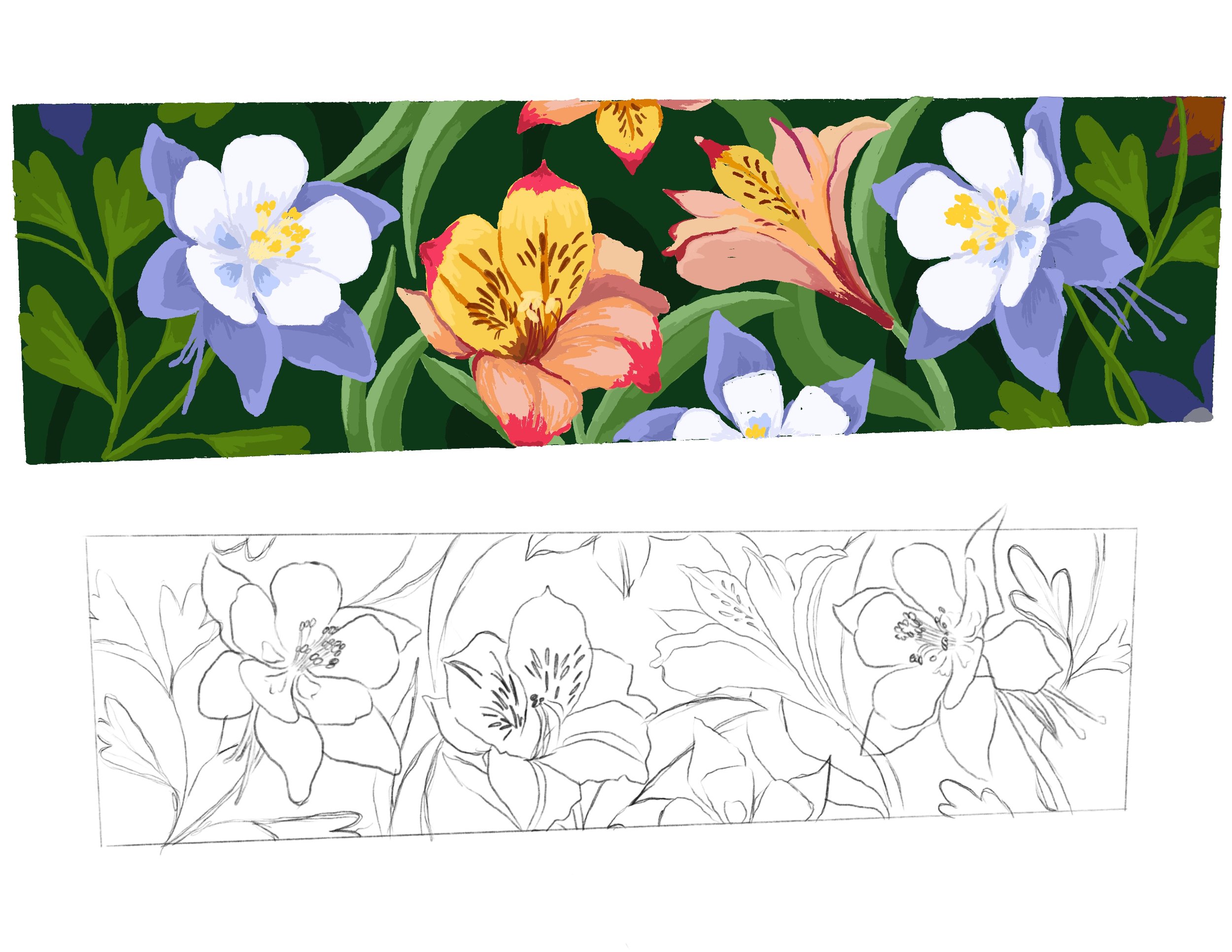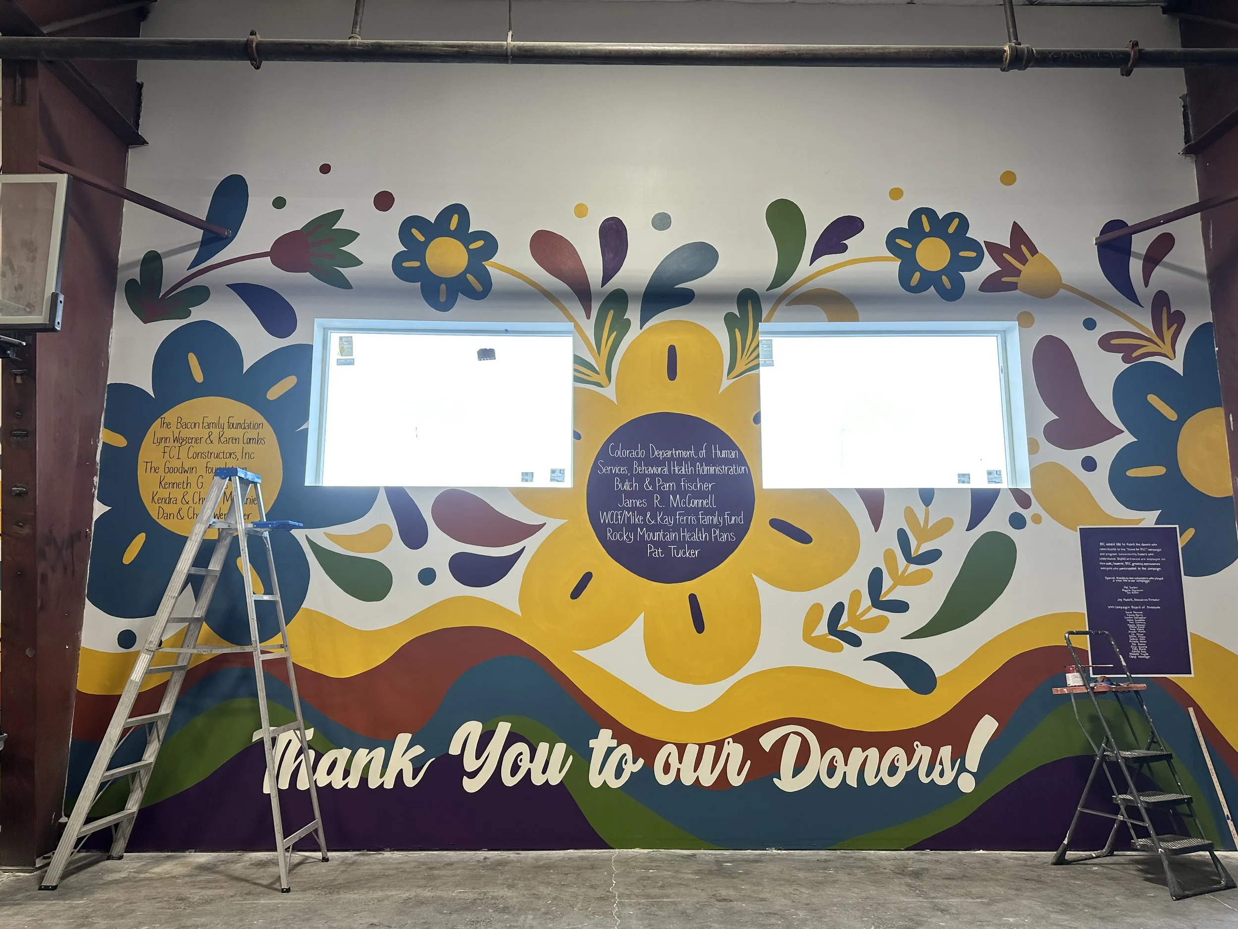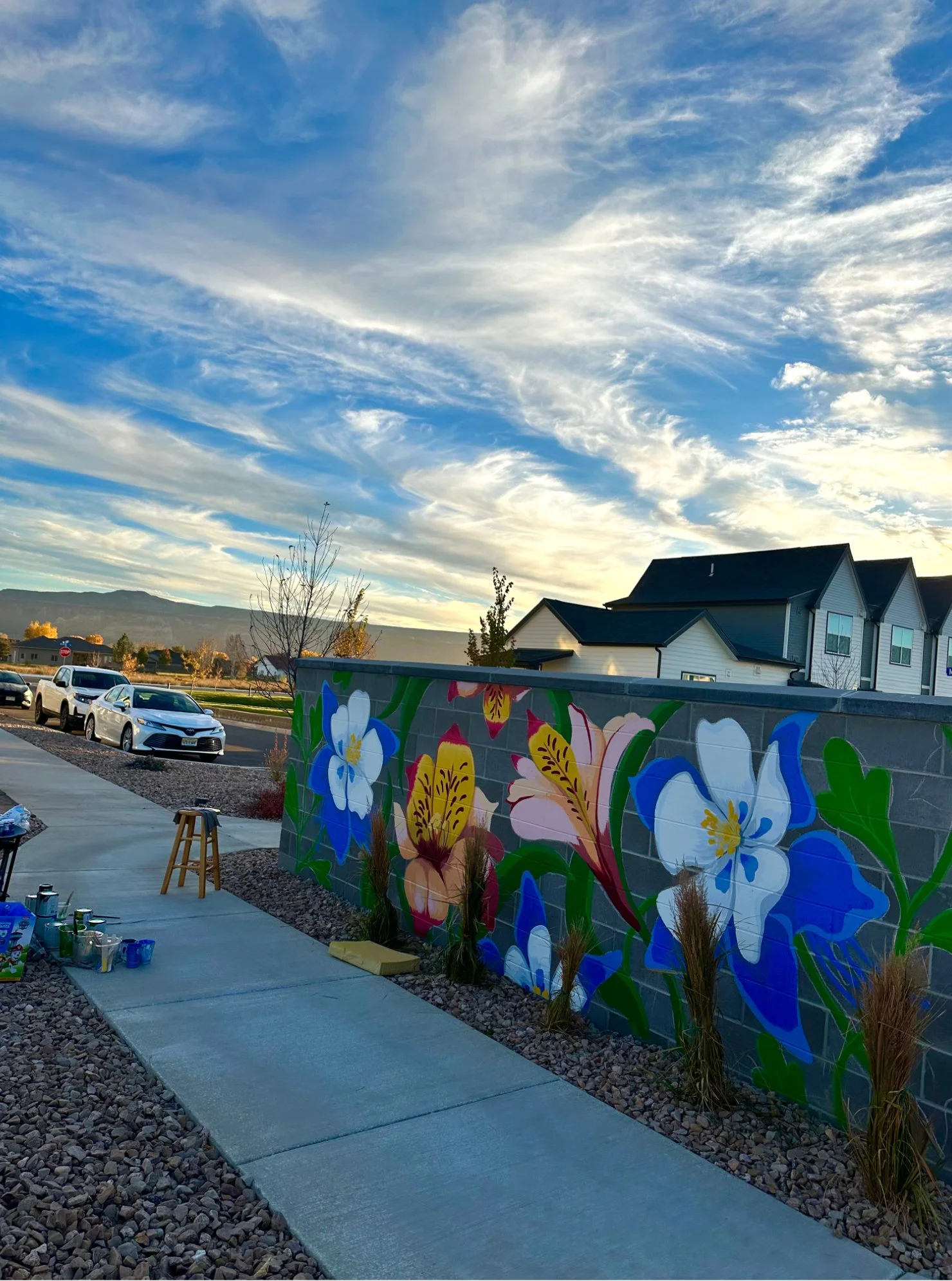 The below is a mural commissioned for a new housing development in Fruita, CO in November of 2025 showing Colorado Columbines and Alstromeria flowers, painted on cinderblock.